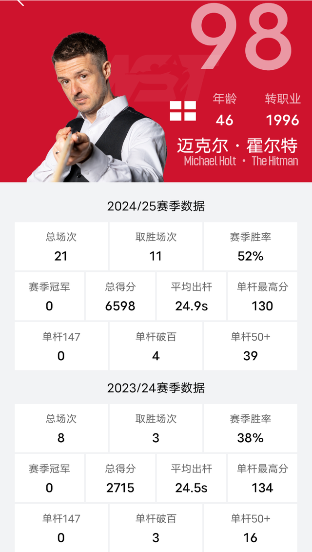 46岁的霍尔特转办事依然28年了,他在1999年就打进了英锦赛八强。但直至2016年才打进活命第一次名次赛决赛,在拉脱维亚的里加民众赛2-5不敌尼尔·罗伯逊。2019年在沃特福德的单局限时赛第二次打进名次赛决赛,但输给了塔猜亚·乌努。2020年在单局限时赛决赛中打败周跃龙,拿到24年办事活命的首个名次赛冠军。本赛季是他重返办事的第一年,天下名轮番98,在32强中最低!此番对决名次赛三冠得主,天下第10加里·威尔逊,首局两边堕入缠斗,霍尔特74-64险胜!第二局加里打出单杆72分一杆制胜逆转!霍尔特跳跃两局乱中取胜,第五局打出单杆69分一杆制胜逆转,第六局打出单杆95分零封致胜,一波四连鞭一举赢得赛点5-1。第七局两边鏖战,各自屡次上手,互作念斯诺克,局分战至53-42,台面仅剩三颗彩球,两东谈主齐不敢掉以轻心讷言敏行举步维艰,最终加里伊始上手打进蓝球,但被霍尔特打进粉球绝杀,大比分6-1晋级16强!